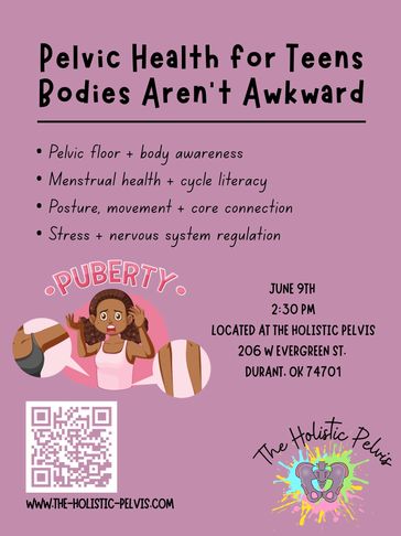 We’ll explore pelvic floor function, menstrual health, posture, movement, and how stress and emotions affect the body. Through simple education and gentle movement, teens will build body awareness, confidence, and tools they can carry with them for life.